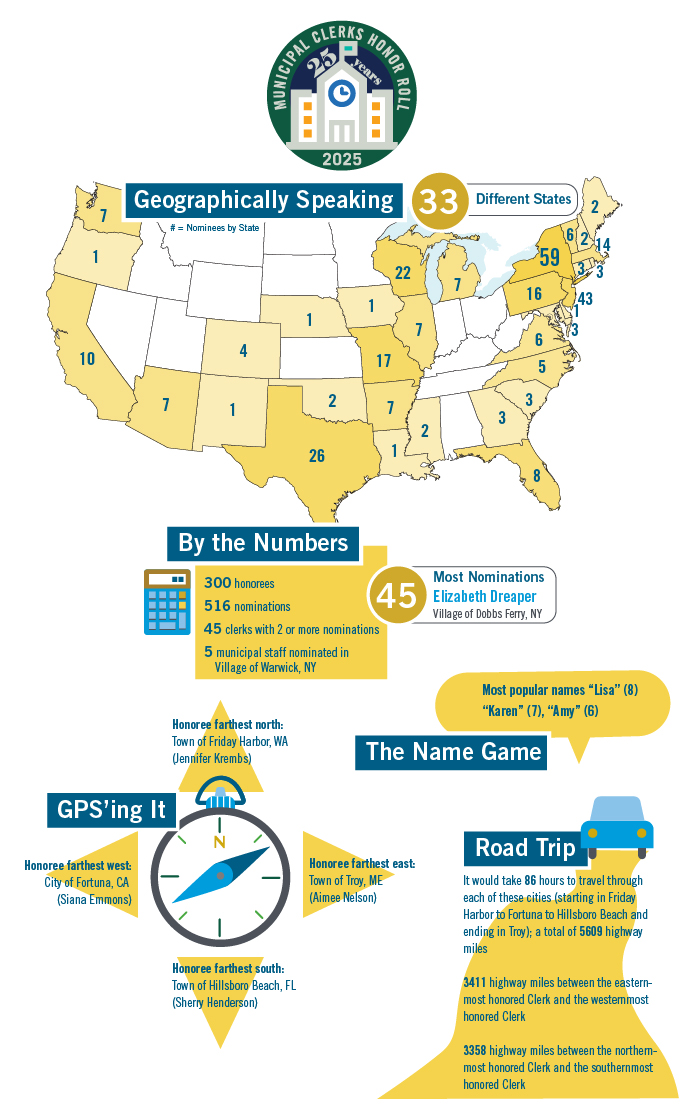 For 25 years, the Municipal Clerks Honor Roll has celebrated the people who bring heart, organization, and compassion to local government. This year’s nominations once again shone a light on the remarkable individuals who make their communities stronger simply by showing up every day with dedication, kindness, and professionalism.