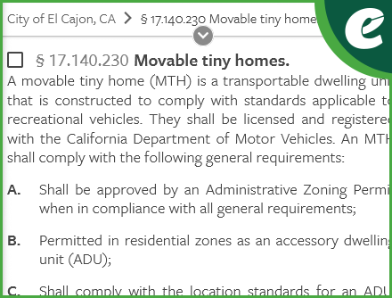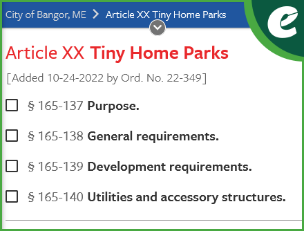 If your community is interested in drafting or updating legislation related to tiny homes in your community, here are some useful examples that can be found in our eCode360 Library: